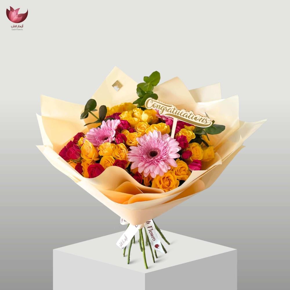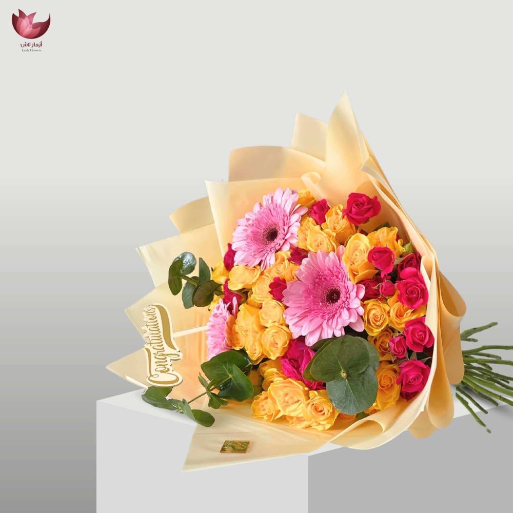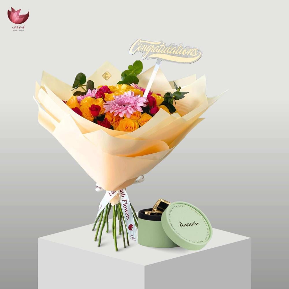 بوكيه تخرج أنيق ومليان طاقة إيجابية، مصمّم بألوان فرِحة تنشر البهجة بكل مكان! مع شوكولاته انوش الفاخرة ليكمل الفرحة بتخرجهم .