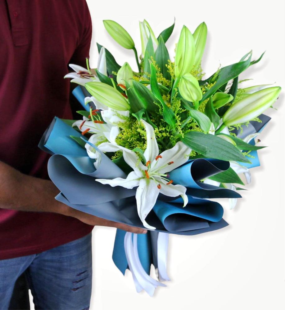 باقة زهور الليليوم بترتيبها المميز وجمالها حين تتفتح البتلات باللون الأبيض الذي يدل النقاء والامتنان، هي أكثر من مجرد باقة، هي تعبير عن مشاعرك الصادقة لمن تحب