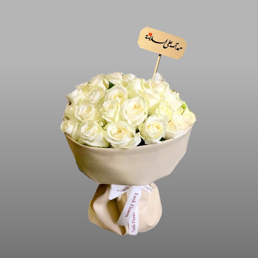 - محتويات الباقة : تحتوي على مجموعة من الجوري الابيض مغلفة بتغليف الجلد الفخم و الانيق .
