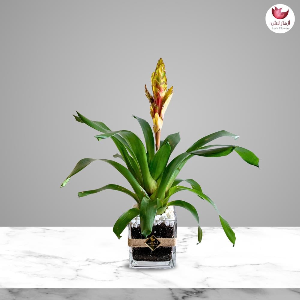 A bromeliad with an orange flower in a glass vase. This beautiful plant adds a charming touch to any space, adding a pleasant and cheerful appearance. It can be placed in living rooms, hallways, and offices.